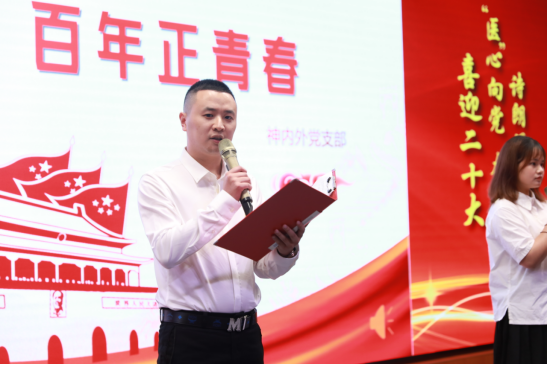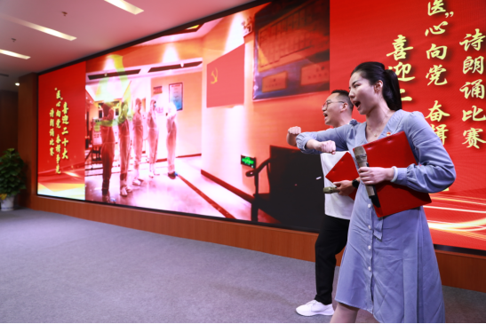 朗誦比賽在手術(shù)支部《醫(yī)護(hù)后浪、醫(yī)心向黨》中拉開(kāi)帷幕,隨后,各支部參賽隊(duì)伍先后登臺(tái),大家以充沛飽滿(mǎn)的感情、鏗鏘有力的聲調(diào),聲情并茂的朗誦,先后為評(píng)委和觀眾送上了《詩(shī)意中國(guó)》《相信未來(lái)》《永遠(yuǎn)跟黨走》《百年正青春》《醫(yī)者》等作品,作品歌頌了中國(guó)共產(chǎn)黨百年來(lái)的光輝歷程和取得的偉大成就,抒發(fā)了矢志不渝的愛(ài)黨愛(ài)國(guó)情懷,展現(xiàn)了醫(yī)院干部職工昂揚(yáng)向上、奮發(fā)有為的精神風(fēng)貌。精彩紛呈的表演激起了與會(huì)人員和評(píng)委的共鳴,贏得了陣陣熱烈的掌聲。值得一提的是,離退休黨支部代表雖未到場(chǎng)參賽,以錄制音頻的形式,在會(huì)場(chǎng)與大家分享,展現(xiàn)了老一輩醫(yī)務(wù)工作者始終不忘投身于愛(ài)院興院的歷史重任中。