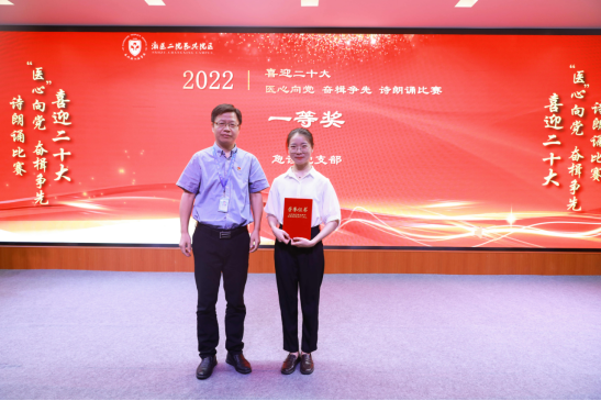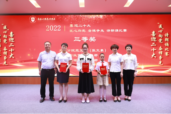 龍山分院黨支部選送的作品《以青春的名義——犒賞每一顆奮斗的中國(guó)心》、行政第二黨支部選送的作品《‘醫(yī)’心向黨 奮楫爭(zhēng)先》、太湖分院黨支部選送的作品《奇跡》榮獲三等獎(jiǎng)。三個(gè)作品均為原創(chuàng),作品《以青春的名義——犒賞每一顆奮斗的中國(guó)心》由母女搭檔演繹,全篇脫稿,情真意切;作品《‘醫(yī)’心向黨 奮楫爭(zhēng)先》由不同年齡段黨員朗誦,謳歌了醫(yī)院守護(hù)一方百姓安康的仁心義舉;作品《奇跡》以女生獨(dú)頌的形式,抒發(fā)了對(duì)偉大祖國(guó)的拳拳愛(ài)國(guó)之情。