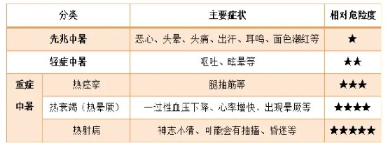 中暑是指在溫度或濕度較高、不透風(fēng)的環(huán)境下,因體溫調(diào)節(jié)中樞功能障礙或汗腺功能衰竭,以及水、電解質(zhì)丟失過多,從而發(fā)生的以中樞神經(jīng)和(或)心血管功能障礙為主要表現(xiàn)的急性疾病。按病情的嚴重程度,中暑一般可分為三種類型,即先兆中暑、輕癥中暑和重癥中暑。